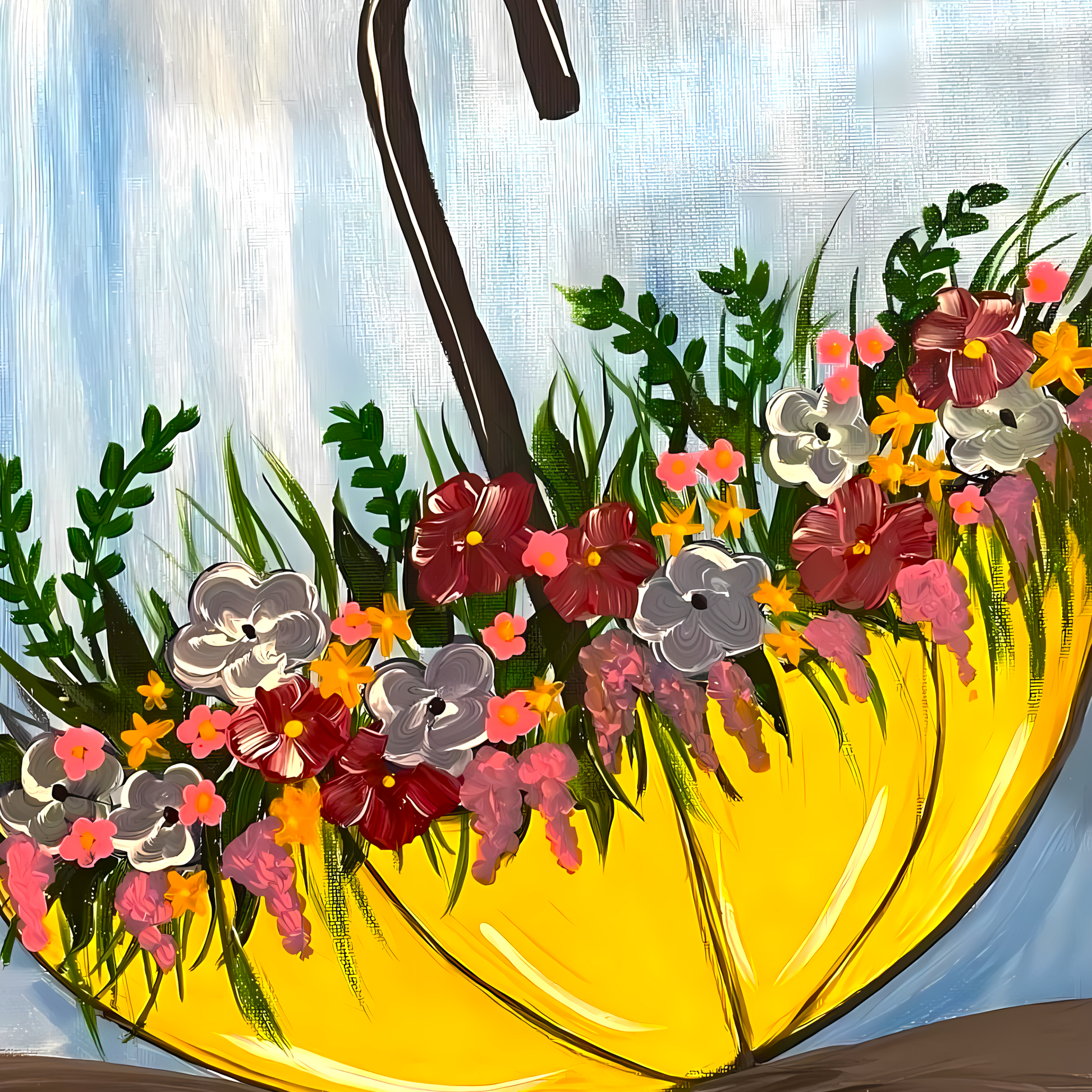 Spring has sprung with this gorgeous yellow Umbrella overflowing with vibrant flowers of every color. Experiment with your own colors and textures.